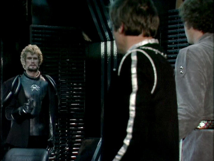 Avon and Vila teleport down to the surface and Vila watches from a distance as Avon approaches a group of pirates led by Benos, who deal in slaves. Posing as a crash survivor, Avon allows himself to be taken prisoner but the plan goes wrong when his teleport bracelet is confiscated. Avon is imprisoned with another subject for the slave auction, Nebrox, who confirms Servalan is on the planet. She bought one of a group of entertainers who was then sent to a black ship, evidently Cancer's, that left shortly beforehand.