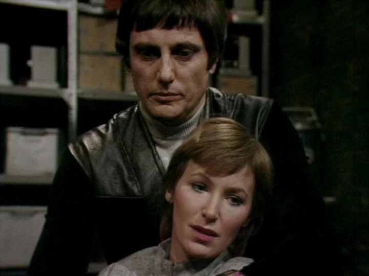 Dayna joins them, having witnessed the arrival of Federation reinforcements. Avon shoots through Servalan's chains then removes his bracelet. Unfortunately, Vila misunderstands Tarrant's instructions and teleports up him, Cally and Dayna without checking the co-ordinates, meaning he can't put them back down. Aiming a weapon at Avon, Servalan tells him to replace the bracelet and call for teleport, intending to send his corpse back to the Liberator. However, Hob then enters the cellar to warn Anna. Servalan kills him but the distraction allows Avon to teleport safely, telling the crew that rumours of his death have been exaggerated...but only slightly.